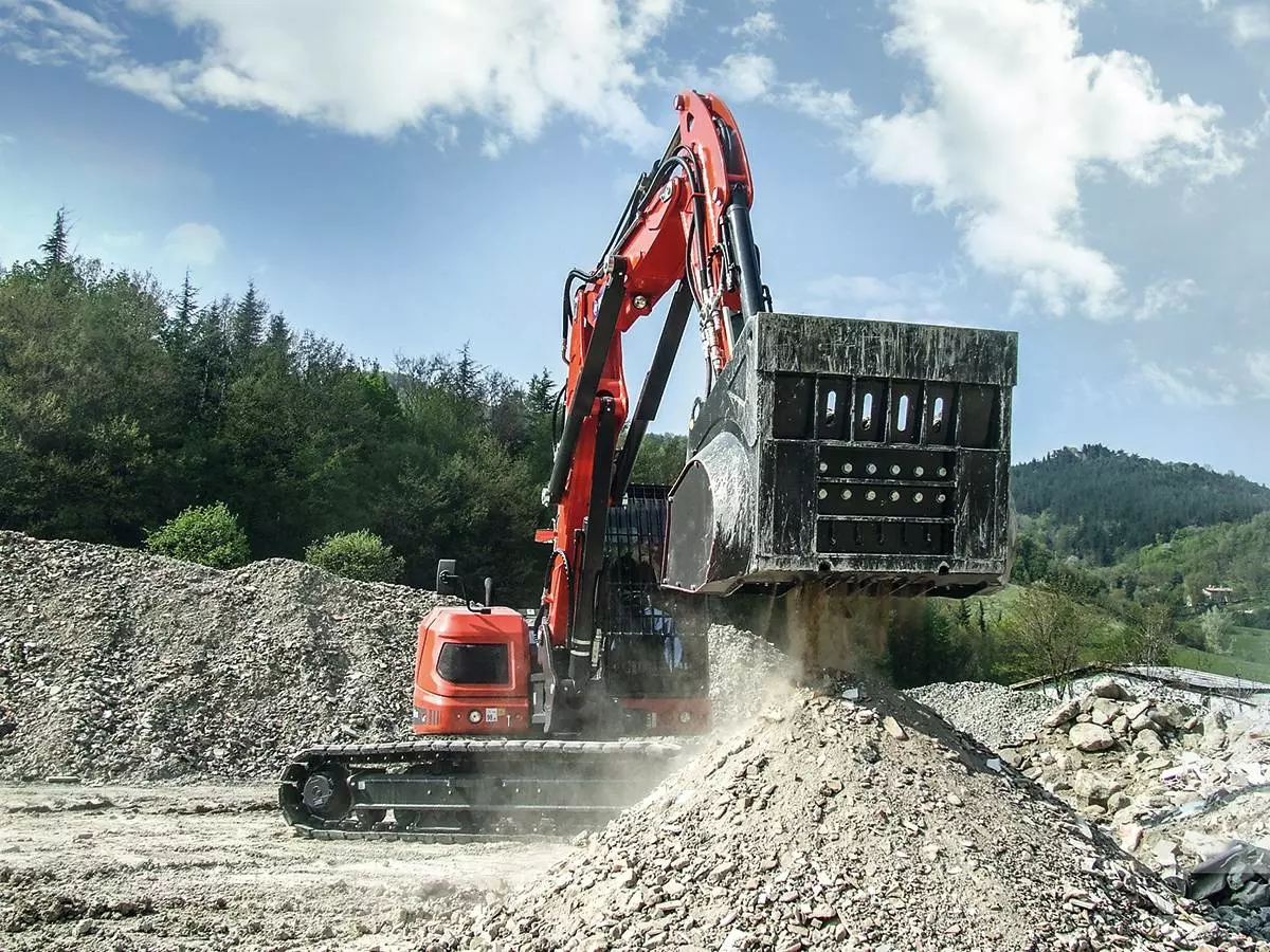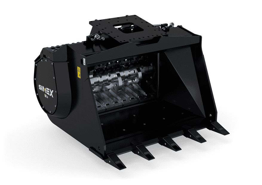 Designed to reduce the volume of aggregates directly on site, CBE crusher buckets with rotor system provide optimal performance when working with iron, rock, soil and deformable parts, and wet or humid materials. Ideal for crushing reinforced concrete and demolition waste. The exceptional cutting force allows any material to be crushed due to the rotor with teeth activated by high-displacement radial piston hydraulic motors in direct drive. Automatic system inverts rotation of the drum in case of blocking (Simex patent).